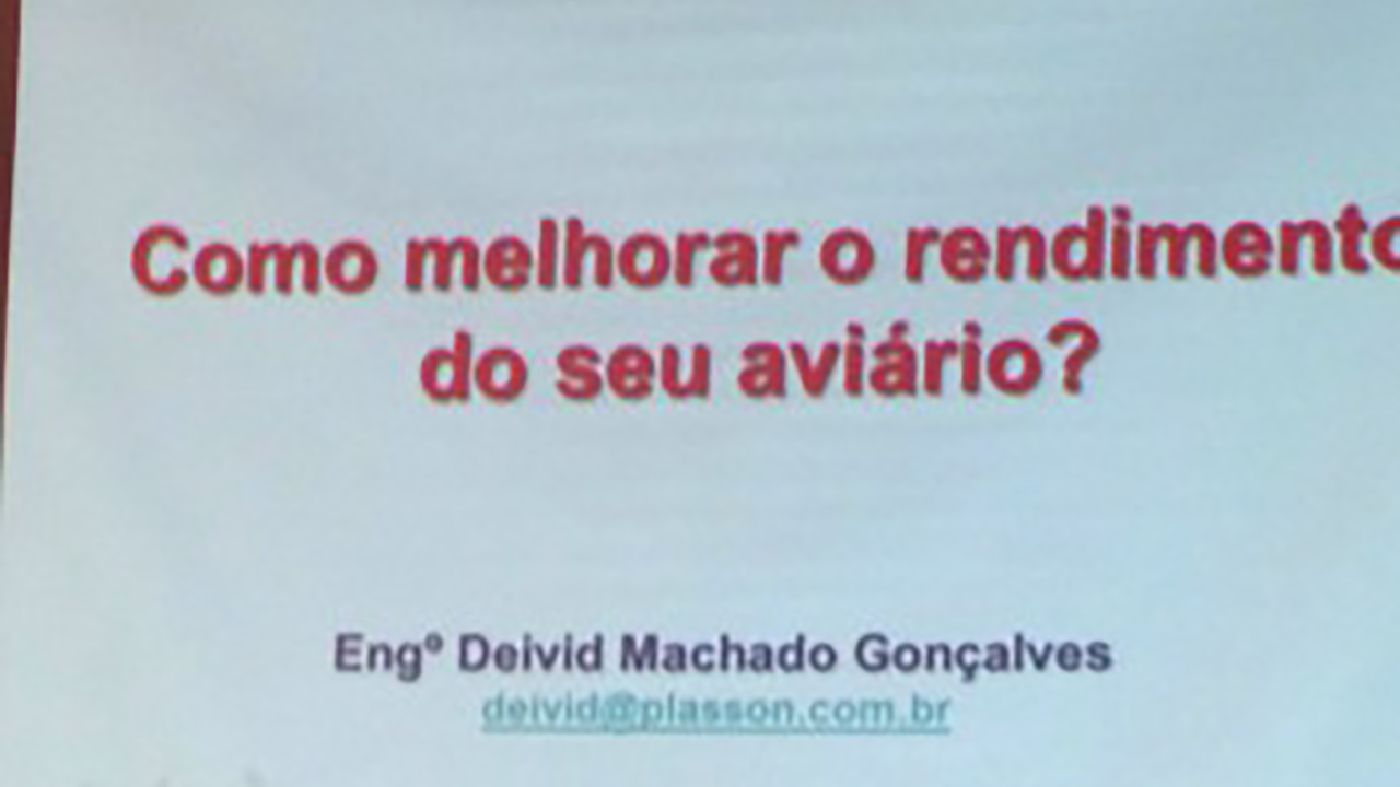 - Como Melhorar o Rendimento do seu Aviário, ministrado pelo Sr. Deivid Machado Gonçalves, Engenheiro Mecânico, gerente da Plasson do Brasil.