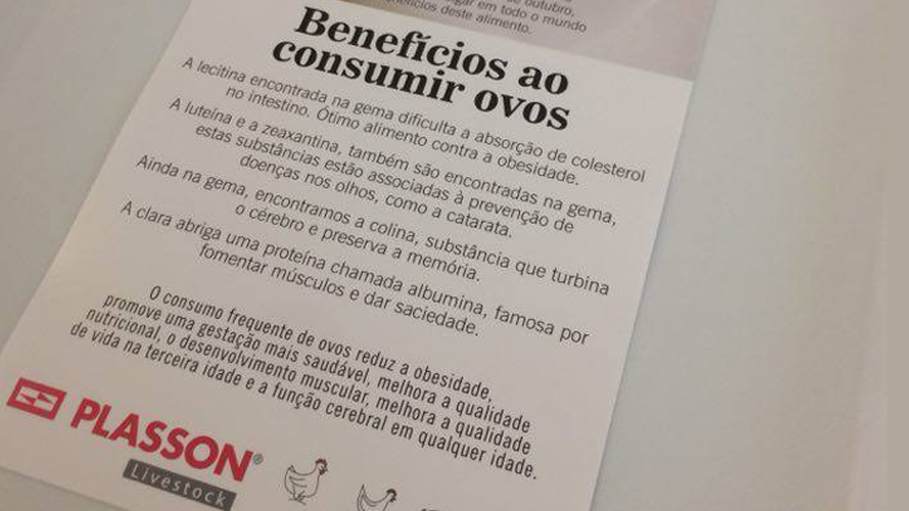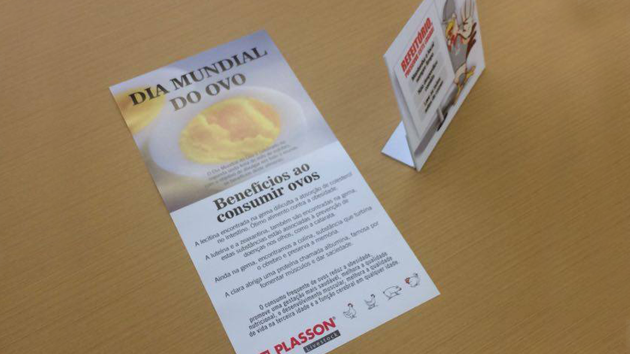 No Dia Mundial do Ovo, a Plasson realizou várias ações para divulgar os benefícios e a importância do ovo na nossa alimentação. A divulgação foi feita através de e-mail marketing, de 01 banner que foi colocado estrategicamente no refeitório e foi adicionado nas bandejas um panfleto com informações nutricionais do ovo, assim a informação era recebida ao mesmo tempo em que era servido o ovo em nosso cardápio.